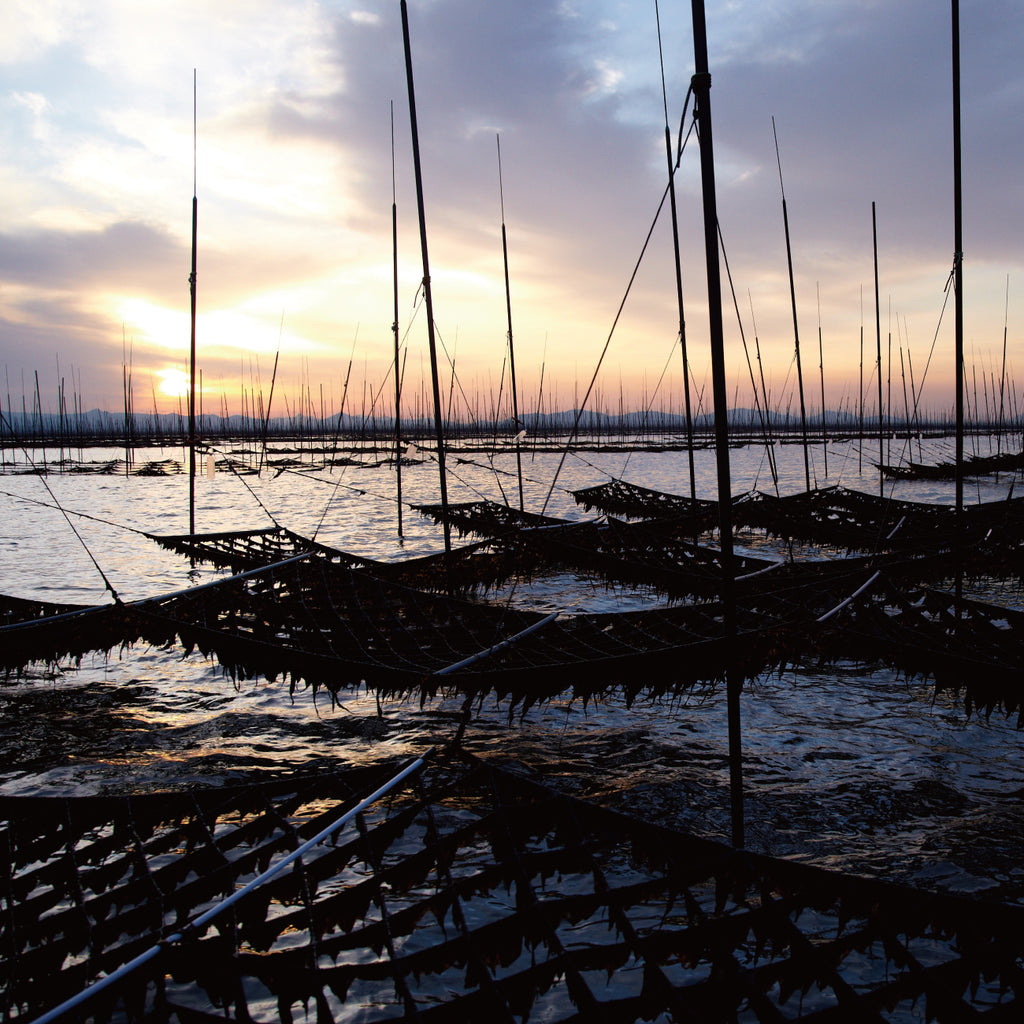 「有明海」は、干満の差のある遠浅の海で、支柱に張られた海苔網は、太陽光をたっぷり受け、乾湿を繰り返し、美味しい柔らかな海苔が育ちます。